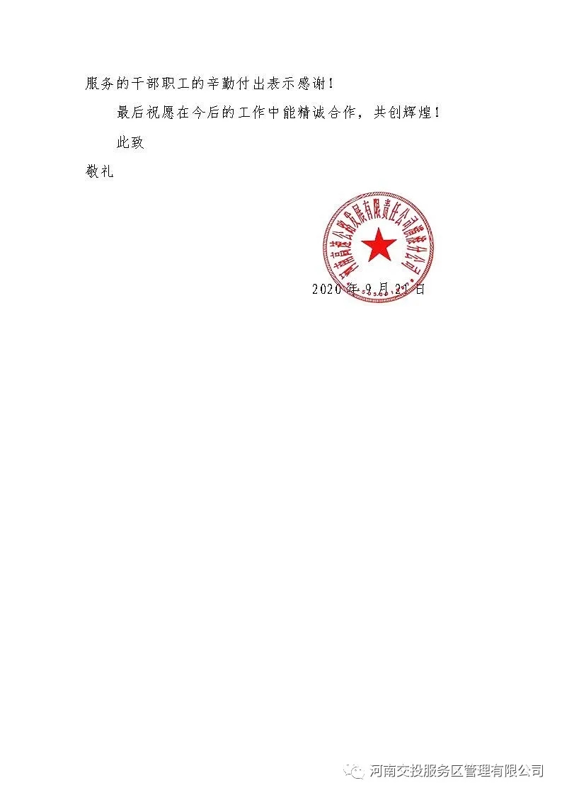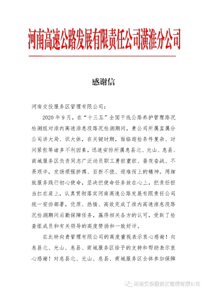 近日,高發公司潢淮分公司給公司發來《感謝信》,感謝公司所屬直屬分公司在2020 年 9 月“十三五”全國干線公路養護管理路況檢測組對淮內高速淮息段路況檢測期間,講大局、識大體,所屬息縣北、光山、息縣、商城服務區負責同志勇擔重擔、晝夜奮戰、不畏艱辛,優質、熱情、高效完成了淮內高速淮息段路況檢測期間后勤保障任務,贏得相關各方的認可,受到了檢查組成員和有關領導的高度贊揚和一致好評。