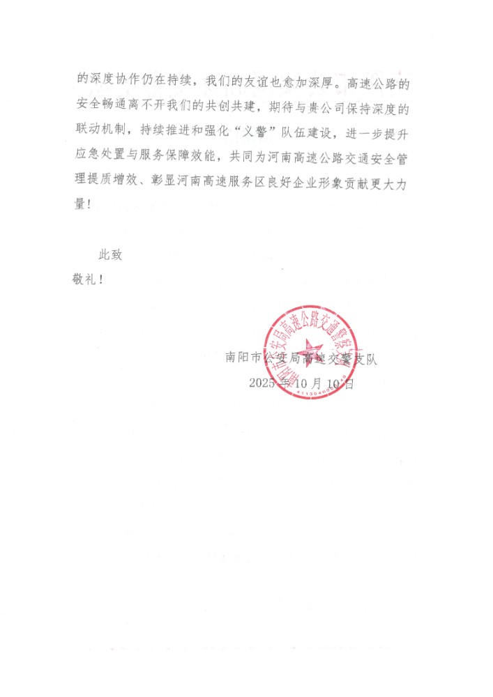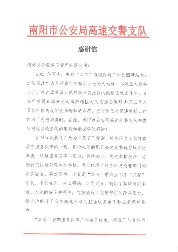 10月10日,南陽市公安局高速交警支隊向公司所屬直屬分公司寄來感謝信,表達對南陽轄區(qū)內(nèi)服務(wù)區(qū)、停車區(qū)國慶中秋“雙節(jié)”期間積極配合做好保通保暢工作的崇高敬意和誠摯感謝。